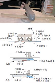 和普通的小型无人机不同,“弹簧刀”对飞行速度的要求范围比较宽,发射以及某些时候侦察时,需要以极低的速度巡飞,而在最后攻击目标时,又希望尽量快点。为增加低速状态下机翼的升力,“弹簧刀”的前翼像有人飞机一样,还在后缘部分设计了一对襟翼。襟翼的结构非常简洁,下方有弹簧片,上方有作动器,两者“夹”着它控制偏折。需要增加升力时,作动器上的电机正向旋转,带动连杆向下压迫襟翼,使其偏折;不需要增加升力时,电机反向旋转,襟翼在弹簧片的作用下回到原位。