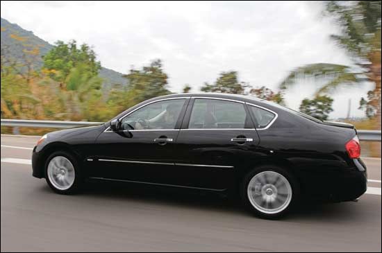 这次试驾的M35是属于英菲尼迪公司的08款车型,在外部设计和内室上有一些小小的调整,整体感觉更符合英菲尼迪公司的家族血统,甚至和它的小兄弟G35有些分不出来。M35在2005年刚刚面世,在北美的销售相当不错,它的定位是豪华运动轿车,从它采用后轮驱动,发动机应用连续14年沃德汽车世界“十佳发动机”的VQ35就能看出它的性能优势。