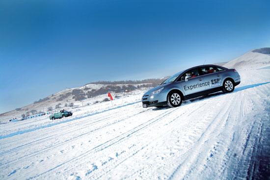 “麋鹿试验”:这项试验是模拟高速公路上经常可能发生的紧急避让,在ESP的帮助下,大多数学员都能够以60km/h的速度在冰雪上紧急避让,并顺利完成试验,但在ESP关闭时,即使是教练也难以控制住车辆。
