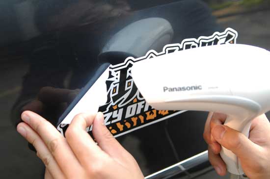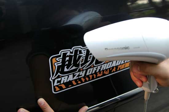 在去除车贴的时候,应该保证吹风机的热风始终保持在贴纸表面吹拂。因此理想的操作形式,是从车贴的左上方入手,右手持风筒,均匀地吹拂即将揭开的位置,左手缓慢揭起贴纸。对于左撇子同志,可以反其道行之,用最熟练的左手控制风筒。