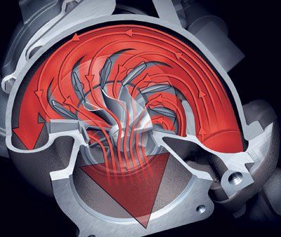 可变涡轮几何特性用来直接改变废气气流中通过转子叶片的截面,为各种情况提供精确和正确的涡轮增压器规格和效果:在低发动机转速时,叶片闭合形成小的气隙。排气流量通过这些小孔加速并在径向以高能级冲击涡轮,如同小涡轮增压器一样。