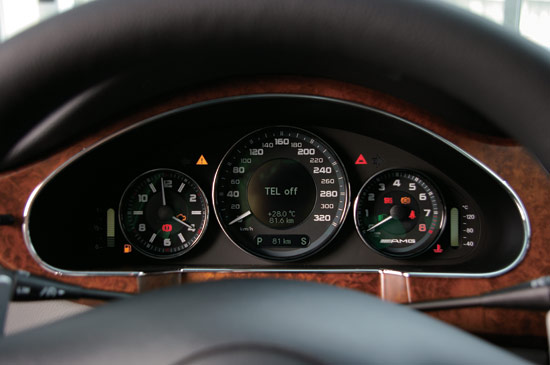 在内饰上,AMG也进行了大刀阔斧的改造。CLS63AMG的前排座椅采用了区别于普通CLS的运动型桶型设计,并且运用Napa皮革进行包裹来提升乘坐舒适性,但是在肩部还是破例运用了Alcantara面料镶嵌,目的在于增加表面的摩擦力,来保持过弯时驾乘者的身体姿态。CLS63AMG拆掉了原来略显优雅的方向盘,换上了自有的AMG人体工程学运动型方向盘,略显椭圆的造型在普通人眼里或许有些滑稽,但更有利于对方向盘的把持。另外,CLS63AMG在方向盘的下部还银色铝制换挡拨片,在变速器手动模式下进行挡位切换,有一些驾驶F1赛车的感觉。AMG的仪表盘内镶嵌了运动计时器,可以轻松记录你在赛道跑完一圈后的成绩,相信这绝不是普通跑车所具有的。尽管如此,在我看来CLS63AMG仍难以堪称完美,内饰中控台依然保留了木纹的装饰,与它的运动风格略显不配,不过考虑周全的AMG准备了丰富的选装配件,其中就包括了内饰的碳纤维饰件,只要你愿意花钱,你的CLS63AMG就会愈趋完美。