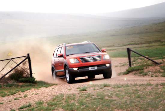 为验证霸锐出色的路上性能,我们选择了夏日的草原,翻过一座座山,到达蓝天和草地的世界。霸锐的车身毕竟很大,轴距太长,虽有出众的悬架系统,依然无法避免转急弯时的侧倾,尤其是后排的感觉比较强烈,这源于后轮的转向不足,有向外甩的趋势,轮胎的动作有时会反应到车里。高悬架对于坑洼路面柔韧有余,草原上行驶可以肆意驰骋,悬架的对路面状况的过滤效果很好,车内没有出现过多的颠簸。霸锐的噪声控制值得称道,安静的草原上,凶悍的发动机却更加安静,怠速在车中竟感觉不出发动机的运转,发生了数次重复打火的现象。行驶在路上时,车内乘员自然也不会为发动机或车外的噪声烦心。