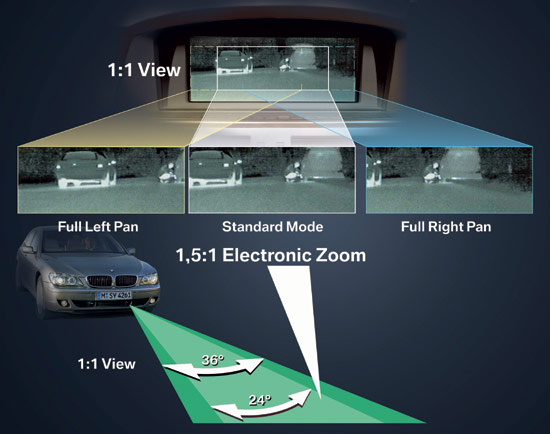 BMW夜视系统的探测范围超过其他技术多达一倍以上,其摄像头具有比其他系统更广的探测角度,以及更长的探测距离(探测距离达300m左右)。在车速低于80km/h的情况下,热成像摄像头拥有的36°的水平广角能够涵盖很广的探测范围。在中等车速下,显示屏上的影像区域能够覆盖车辆前方24°范围的景象,并且影像区域还可以随着道路转弯而进行6°的左右转动。在较高车速下,驾驶者还可以启动数字变焦功能,进而使较远距离物体的影像放大1.5倍。