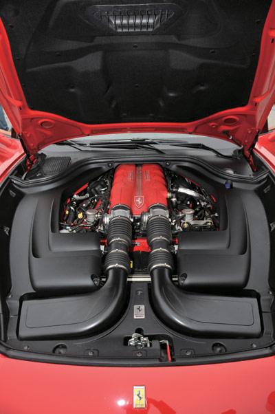 在踩踏油门的同时自动解除手刹,你会立即被发动机的性能和双离合器的品质所征服,这款4.3L的具备双可变气门正时系统的动力传动器会对任何微小的油门踏板移动做出反应。想试试V8发动机的极限吗?深踩油门踏板,California已经以不可思议的速度冲了出去,在4秒内可从静止状态加速至100km/h。338kW最大功率的V8发动机同全新的双离合器变速器配合的十分完美,你会发现换挡成为一种乐趣,当你还在使用前一个挡位的同时,两个平行设置的离合器在换挡前已经调到下一个挡位上了,并在一定程度上启动了它,带来的最直接的好处就是转速损失很小、换挡时间更快,具体时间介于F430和F430Scuderia之间。法拉利和G-Track系统有着很完美的合作,驾驶California不仅可以飞速行使,而且可以享受安静的巡航,经过修改的底盘稍稍放弃了法拉利的不安分,但是你也可以选择“Sport”模式,在需要时可提供足够的运动性能,以便让你可以体会到法拉利的传统。由于采用直接喷射,V8发动机少消耗约20%的燃料,规定的13.1L/100km的标准油耗日常巡航最为合适。
