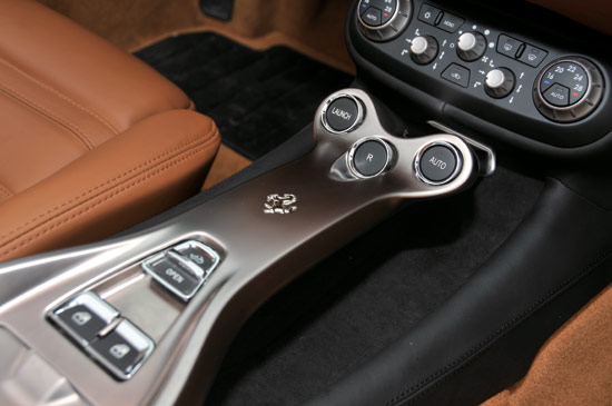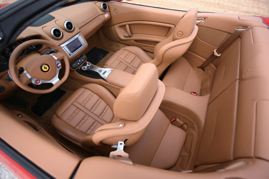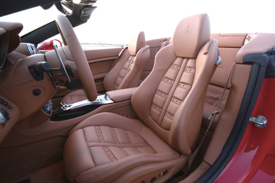 California是现今世界上顶篷变换时间最短的车——只要14秒钟,就可使固定的顶篷迅速消逝在行李舱里,而且顶篷开合并不需要停下车来。在车内驾驶员会迎来熟悉的法拉利感觉,只是演绎的更加现代。仪表盘和方向盘包括启动按钮和Manettino(驾驶模式转换旋钮)都显得那么熟悉,相反铝制的弧形卫星导航副仪表板会让你感到意外,铝制下仪表板上分布着启动控制、倒挡、自动挡模式、车窗玻璃升降器和顶篷控制等旋钮,造型很像中国的如意,一切的布置都一目了然,自动空调也采用了分区空调。