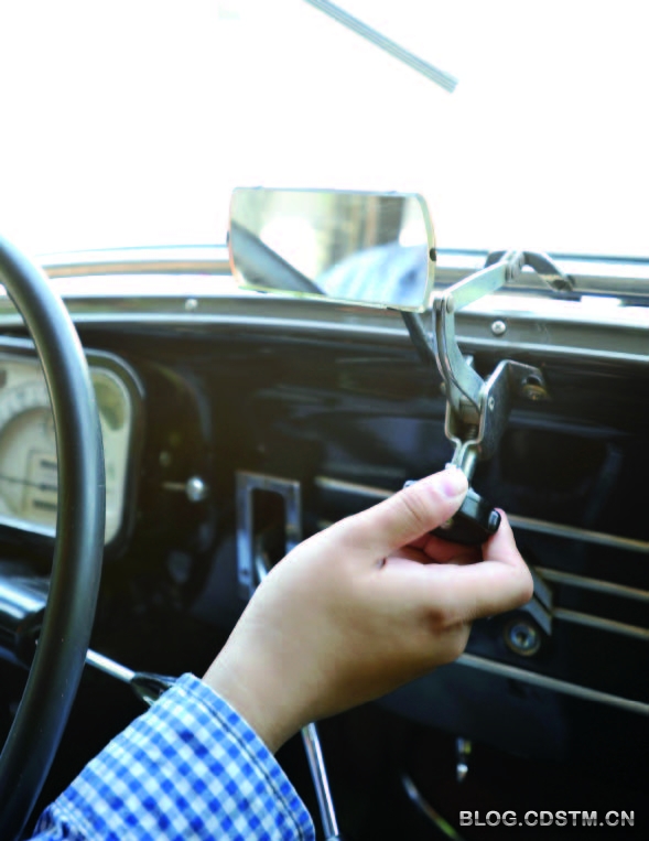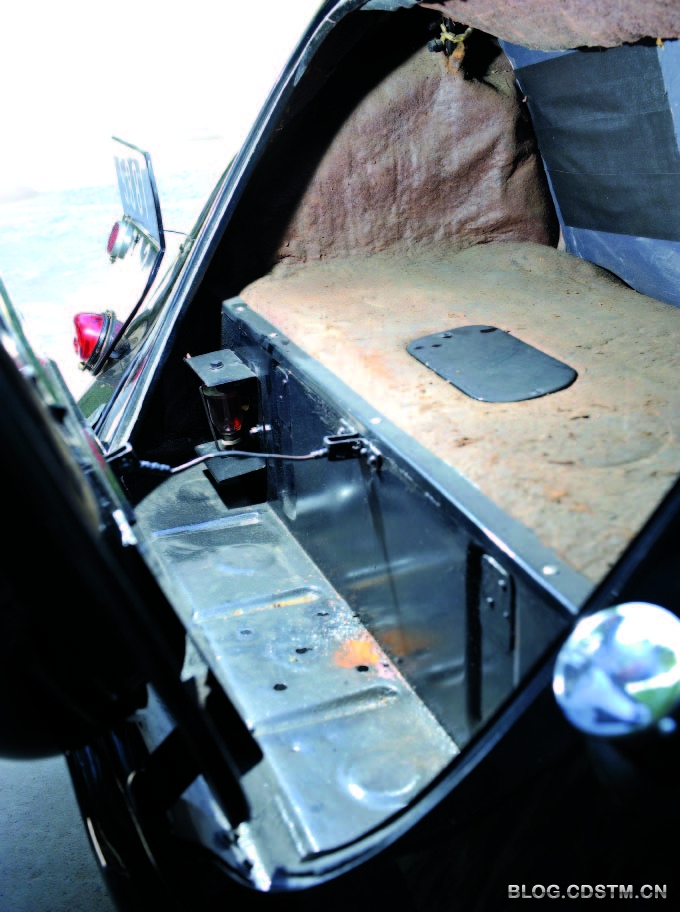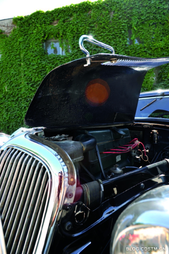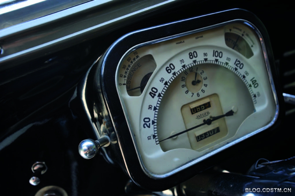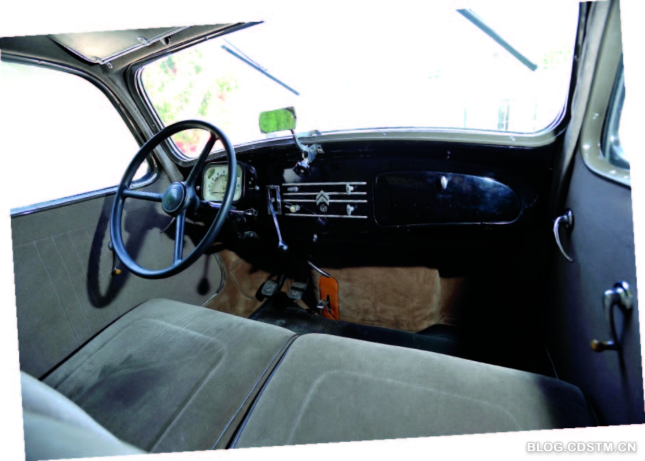深驼色的绒面内饰很有法国味道,内饰的材料和工艺都很简单,但是做工很规矩。绒面和金属两种材质创造了很优雅的车内氛围,这种氛围不仅通过材料的质感焕发出来,更通过很多简单而又到位的工艺细节表现出来。车门内衬和座椅上的几道简单的缝线,让原本显得比较原始的绒布内饰立刻变得设计感十足。有时候不得不赞叹老一辈的汽车设计人,他们在很有限的材料和工艺水平下巧妙地创造出了那么多的经典设计。采用钢板冲压加黑色喷漆的前仪表台同样简单而别致。像大闹钟一样的仪表在有限的尺寸内清晰地提供了和现在汽车一样多的车辆信息。表盘采用了很有韵味的乳黄色上下两层镂空设计,表针位于下层而刻度位于上层。使驾驶者可以更清晰地观看到刻度,同时又使下层的表针可以完全和刻度重合,真可谓精妙。巨大的胶木方向盘手感很不错,从前仪表台上向下伸出的换挡把很有意思。3挡手动变速器操作起来的姿势很像老式130卡车,需要驾驶员手心向上握住它。让我们再来看看中控面板上有什么好东西,黑色油漆的金属中控台上由两条镀铬条进行了简单的装饰,中间的镀铬雪铁龙车标简单而极富装饰性。位于车标上方的旋钮可以通过旋转将前挡玻璃打开一个缝隙,缝隙的大小可根据所需的进风量随意调节。在那个没有空调的年代,这真是绝妙的降暑方式。位于旋钮上方的车内后视镜绝对比今天任何车的车内后视镜都要好用。因为它和前窗后窗位于同一高度上,实际驾驶时只要驾驶者正常向前看就可以随时关注到车后的情况,而且后面的车况没有经过高低变化,十分真切。坐在驾驶座上向前看去,分别屹立在车头的机舱、大灯和挡泥板像灯塔一样准确的向驾驶者标明了车辆前方的长度和宽度,在这一点上今天的轿车只能自叹不如了。