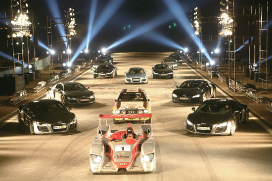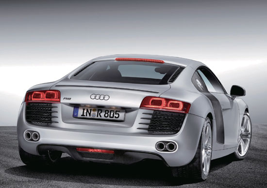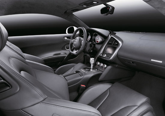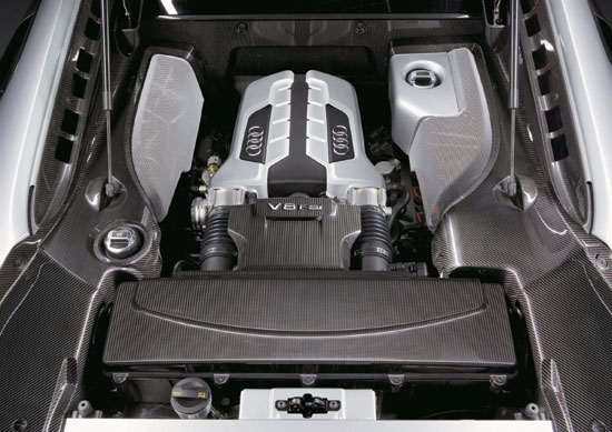 奥迪R8采用中置发动机的设计,在这里不得不提到全世界首款采用中置发动机的奥迪银箭赛车,基于这一设计,才使得银箭赛车获得完美的前后载荷分配,才有了上世纪30年代的超过400km/h的路上速度纪录,以至于F1方程式的赛车也以此作为标准。位于乘员身后奥迪R8的发动机舱盖是透明的,这是一种明显的暴露倾向,美丽应该被展示在外是西方的开放思维,当然也说明奥迪有着这样的自信,于是V8 4.2L FSI发动机被当作艺术品一样展览出来,两组LED灯则在夜间照亮了整个“橱窗”,因此即使夜间,这一美丽也不可能被人忽略。