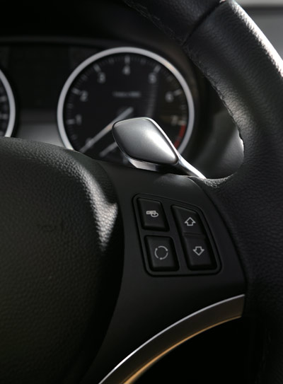 当然如果你抛开谨小慎微的态度,迅速地让油门行程过半,事情将会有所转变,或者更直接一点使用S挡,你会发现转速表与刚才相比如同被注射了兴奋剂,瞬间就跑到了5000r/min的刻度位置,每次点油门都有一种被弹出去的感觉。130i还可以通过方向盘上的按键进行换挡,我之所以称之为按键是因为它们被设计得又厚又方,没有拨片的感觉,另外采用了提升挡、按减挡的操作方式,这在我看来并非最顺手的设计。好在变速器的手动模式拥有一套敏感的神经系统,动动手指变速器就能够迅速做出反应。