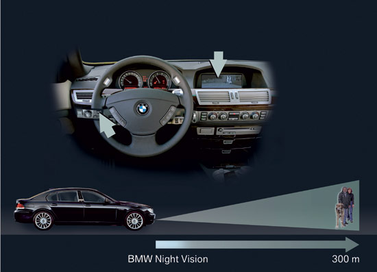 BMW夜视系统采用了军用级的夜视技术,其主要特点在于探测距离长、探测角度大,同时能够把人、动物和背景区分开来,从而使得在驾驶过程中辨认人或动物更加容易。这是一套全新的驾驶者辅助系统,能使夜间驾驶的安全性和舒适性显著提高。这套基于远红外线技术的感测接收系统,以模块化的方式集成在车辆已有的电子环境中。系统安装只需增加热成像摄像头和控制单元两个硬件部件,用于显示影像的8.8英寸显示屏随专业级导航系统一起安装,热成像摄像头直接以探测到的物体和行人的热辐射作为影像数据的来源,而无需车辆提供额外的红外线光源。