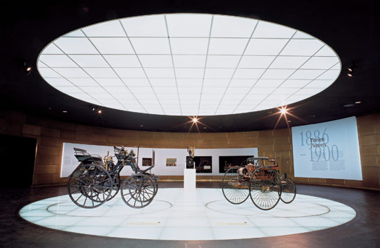 世界第一辆汽车和第一辆四轮汽车。右侧为采用链传动的“奔驰一号”三轮汽车