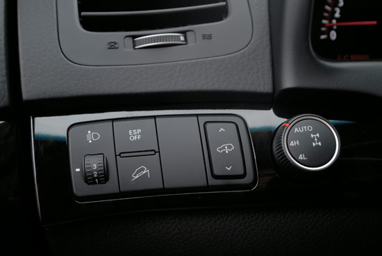 拥有三种四驱模式,使草原上的小土丘不会对霸锐造成威胁,当驱动模式调节到4L模式,霸锐的扭矩以50∶50的固定比例分配给前后桥,面对50°的高坡,霸锐也丝毫不会怯场,在强大驱动力的配合下,高坡被稳稳地征服。如果你不放心,当你了解了两套先进的控制系统后你就会如释重负。面对坡度的时候,霸锐先进的控制系统立刻启动。上坡停车后,重新启动行驶时,上坡启动辅助控制系统(HAC)让霸锐自动制动2秒钟,避免了通常在上坡时经常会出现的溜车现象。而下坡时在没有刹车的情况下,霸锐保持8km/h匀速运行(DBC),让驾驶者更能将注意力集中在方向盘的控制上。