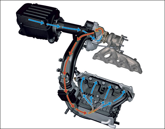 一方面更精确地控制燃料,另一方面当然要在吸入空气量上做文章。对进气进行增压的思路来源于航空发动机,飞机在空气较稀薄的高空飞行,为了保证燃烧效果设计者们开始了对进气增压的研究。而应用到汽车上的增压方式大致可分为机械增压、涡轮增压和气波增压,其中最常见的无疑是涡轮增压。涡轮增压器的结构很简单,由发动机排出的废气驱动涡轮,涡轮带动同轴另一端的压气机对进气进行增压。尽管这样的设计使增压效果会产生一些滞后,但由废气驱动的涡轮增压器不会额外消耗发动机功率,仍然不失为一种提高发动机输出功率和扭矩的实惠之选。
