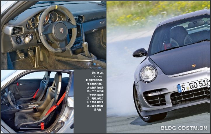 保时捷GT2 RS超级跑车把驾驶者限制在赛车桶式的座椅中。四点式安全带可以由个人意愿决定是否投入使用。6挡变速器的线路被改短。