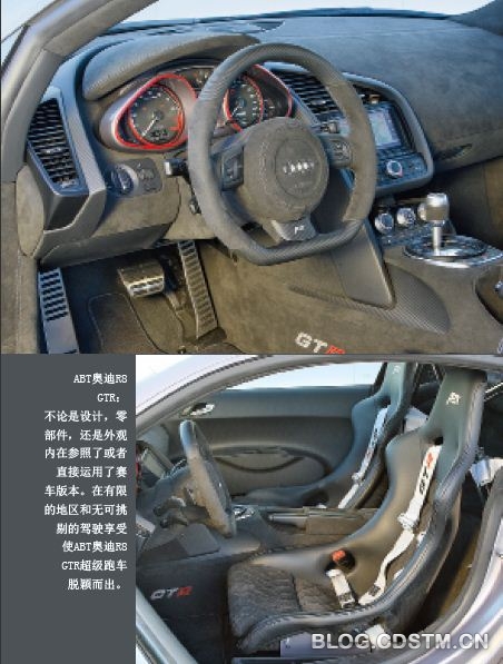 驾驶员像被钉在了ABT R8超级跑车中,赛车桶式座椅和四点安全带使得驾驶员没有多余的活动空间。正如A B