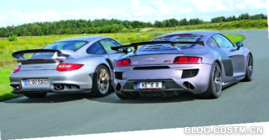 在街道上不能再出现其他的跑车:拥有456kW超级强劲动力的奥迪R8 GTR与保时捷GT2 RS超级跑车正在进行封闭的赛道测试。