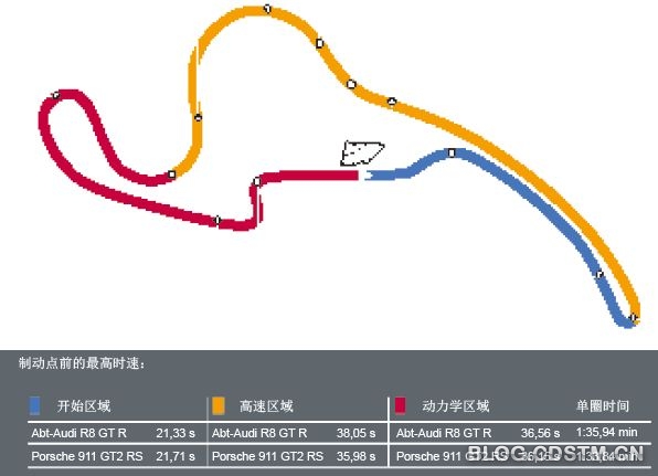 需要一个稳定、精确运行的抓地力。第一个难题就显示出了超级911跑车的潜力:毫不费力的轻松转入运动减振模式。速度保持在A B T超级跑车标准。在任何加速阶段街道长度对于这个动力能达到700 N·m的巨人都不存在问题。你绝对不会想把手从变速排挡上松开,因为下一个换挡会让你应接不暇。所以911在最高时速方面领先了ABTR8 1.7s。保时捷在弯道加速领域也是教科书式的杰作。驾校中学习的刹车点,减速点驾驶员通通可以忽略。GTR RS 特立独行。最后驾驶者会在仪表盘上看到1:33.84,我们的记录中至今没有任何其他车辆达到过这个速度。