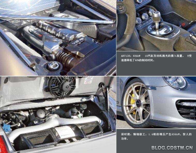 G T 2 R S超级跑车还要再添加一名新成员,第一名:ABT超级跑车是从386kW的R8 V10衍生而来。在大约14个工作日内技师拆卸了崭新的Audi超级跑车,重新装配改良使其重量减少了100kg,一步一步慢慢改良。相对于街道飞驰,限量25台的Hammer超级跑车更适合作为赛车;这部超级跑车的很多零部件都直接来自赛车发动机部门;现在这个部门已经成为德国汽车俱乐部GT赛车部的明星部门。而现在已经有16辆R8