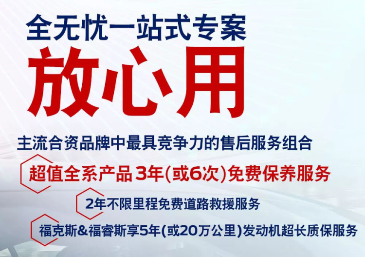 而在服务专案中,长安福特在行业内首推全车系3年(或6次)免费保养服务,以及2年不限里程的免费道路救援服务,加上此前推出的针对福克斯和福睿斯车型的5年(或20万公里)发动机超长质保服务,为消费者带来了更全面的服务保障。同时,针对有换车需求的消费者,也制定了值得信赖的二手车置换无忧服务。
