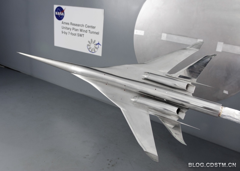 图SST01 NASA研究人员正对波音提出的一种超声速客机构型方案进行风洞吹风试验,这种新构型的音爆噪声已显著降低。