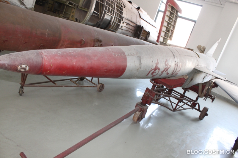 在2楼一个角落里,摆放着这架外形颇为奇特的飞行器,其简练的气动外形和尖锐的头部彰显了其高速的本质,下方的发动机等设备已被拆除。几经查证,我们确认它是上世纪50年代末研制的南航二号超声速靶机。