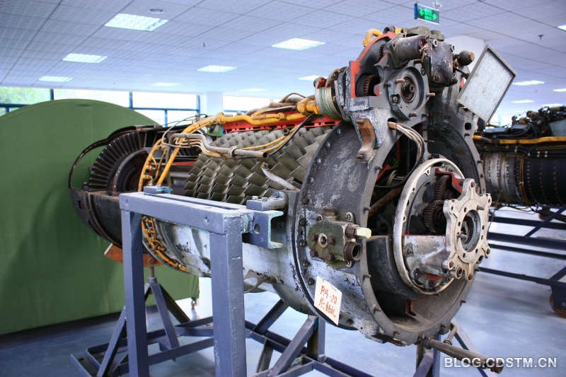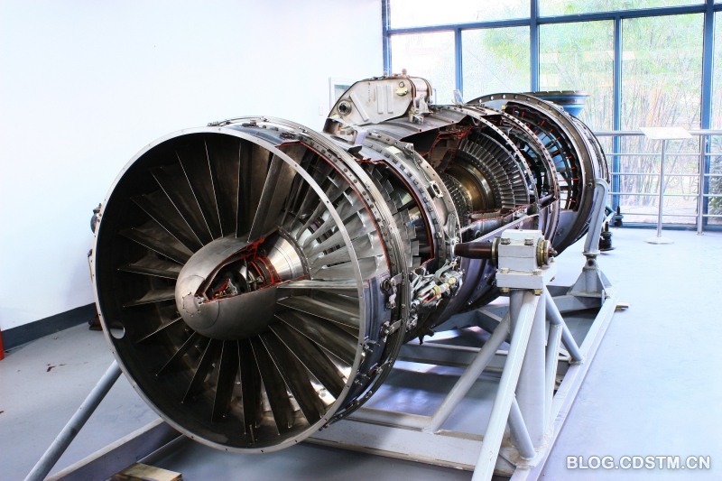 台美制JT3D涡轮风扇发动机,发动机的机匣和外壳已经拆除,暴露出其中的内部结构。JT3D双转子涡扇发动机是普惠公司在其J57军用涡喷发动机的民用型JT
