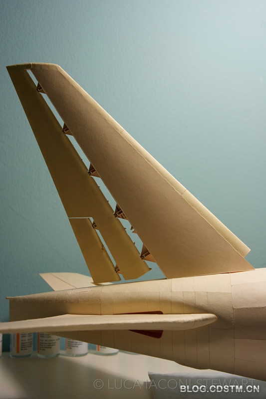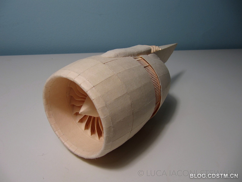 这是一件细致到令人屏息的精湛模型,和它相比,任何传统纸模一下子沦为小儿科。制作过程异常艰苦,单是制作机内各种座椅,斯图尔特就花了整整一个夏天——制作一个经济舱座椅要20分钟,商务舱座椅需要4到6小时,而头等舱座椅需要8小时!为了逼真复制出发动机,斯图尔特用了一个月来设计,然后又花了4个月才完成制作和组装。许多部分都多次返工,光是尾翼部分就返工了3次,浏览斯图尔特在Flickr上的个人页面,你会发现1.0与3.0版本之间的明显差异。