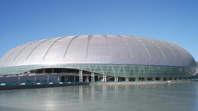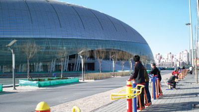 操着浓厚天津口音的朋友带着我们边看着场馆,边滔滔不绝地向我们讲解着,突然,他话题戛然而止,转过头问我们:“你们在北京没见过这个建筑物吗?”我们中的一个朋友快言快语回应道:“何止见过,太熟悉不过了。人民大会堂旁像一个‘鹅卵’的国家大剧院,和这个体育场的外形太像了。”只不过国家大剧院是对称的椭圆形,全封闭;“水滴”体育馆长度略不对称,顶部不封闭,但环绕着它们的一池湖水,把它们映衬得都壮观多姿,相得益彰。