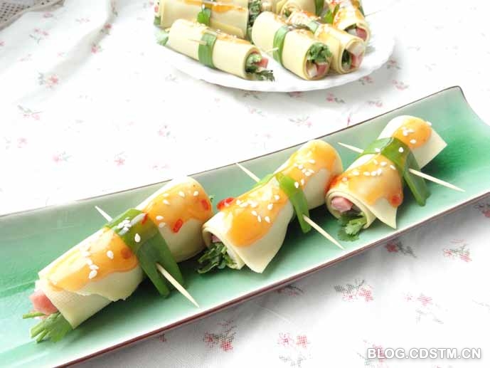 6. 用香葱叶捆扎卷好的豆皮卷,插上牙签防止豆皮卷松散。