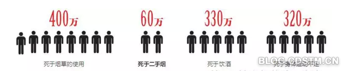吸烟、过量饮酒、不合理饮食、运动量不足,生活中的这四大不良行为,严重威胁着人类健康,是导致慢性病高发的罪魁祸首。四大危险因素对慢性病的影响力有多大呢?根据世界卫生组织的统计,全球每年约:
