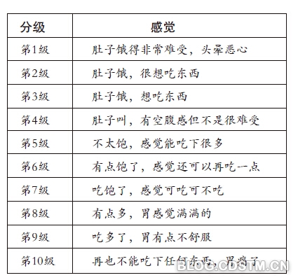 正常情况下我们的胃就和我们的拳头一样大,吃饱的话胃就会鼓起来。我们可以把饱腹感和空腹感用10个级别来表示,下面的这个表格就很形象。如果是为了健康生活,吃到七分饱就可以了,如果你还有减肥的艰巨任务,那就六分饱。