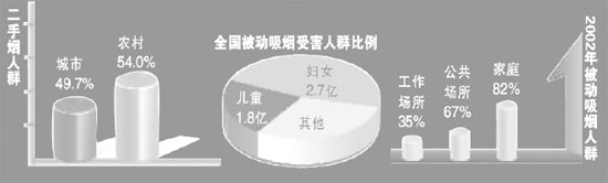 2002年国家吸烟行为流行病学调查显示:公众对被动吸烟危害健康的知晓率为35%;《家庭医药》网络调查显示:86%的受访者认为“二手烟有害健康,但因被空气稀释,危害小于直接吸烟”。