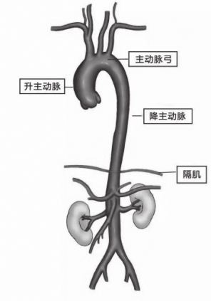 主动脉(如上图1)是人体从心脏延伸出来的一条最粗大的血管,更是人体的主要血管之一,它的任务非常艰巨,时时刻刻都要给我们身体大部分内脏供血。长长的主动脉以膈肌为分界线,在膈肌以上的部分达到胸腔,所以叫做胸主动脉;穿过膈肌后主动脉进入腹部,这部分叫做腹主动脉。
