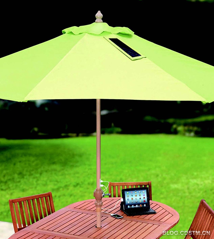 为户外所设计,在伞的顶部有四个太阳能电池板,有两个USB 接口可以为电子设备充电,强大的备用电池确保就算在阴天也可以不间断供电。