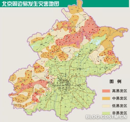 除了山体滑坡,北京周边也有发生其他地质灾害的危险,比如泥石流、崩塌等。为此,地质部门绘制了一份北京市地质灾害易发程度分区图,该分区图将全市地质灾害隐患地区,按照平均降雨量、暴雨几率、水土现状、隐患点等因素,划分为四类:高易发区、中易发区、低易发区以及非易发区。
