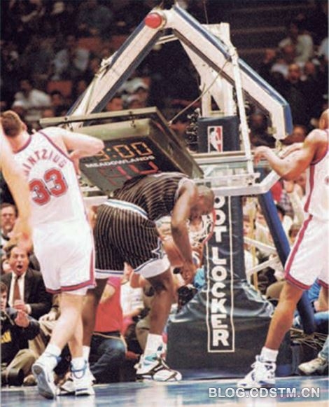 最具破坏力的扣篮:1993 年2 月7 日,刚刚进入NBA 的奥尼尔,在魔术与太阳的比赛中向人们展示了他的力量。当时,奥尼尔在底线左侧起跳把队友投偏的球补扣进篮筐,没想到篮筐完全经不起他的冲击,在晃悠了几下之后轰然倒地。就在2 个月之后,奥胖再度让篮筐篮架遭殃,在与篮网的比赛中,他在一次进攻中从底线右侧杀入篮下,奉献了一个势大力沉的暴扣。令全场球迷感到震惊的是,奥尼尔这次灌篮使得整个篮架基座轰然倒下,他也差点被掉下来的计时器砸到脑袋。
