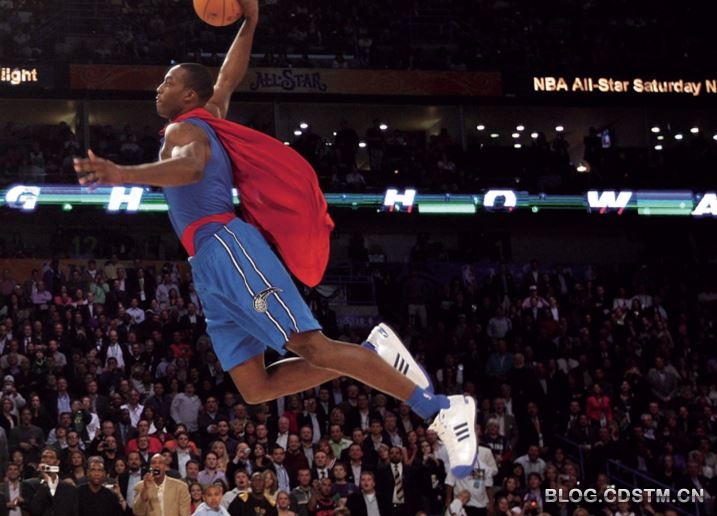 最高的扣篮王:霍华德除了拥有惊人的身体素质外,也是个善于搞怪的大个子。2008 年2 月17 日,在新奥尔良NBA 全明星扣篮大赛上,他身穿超人披风,从罚球线内一步起跳,完成了左手触摸篮板,右手扣篮的动作,得到满分50 分,成为有史以来身高最高的扣篮王。