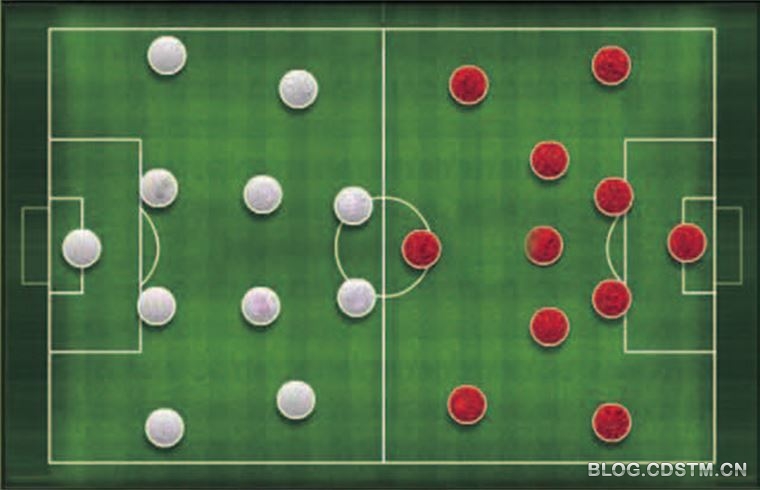 目前世界足坛主要流行的阵型都有一个共同点——4 个后卫。在稳固防守的基础上,再安排进攻球员的站位。其实,足球场上无非是22 个人的对抗。要想赢得比赛,就必须依靠教练们合理地排兵布阵,尽可能地让手中这11 张牌都发挥最大的作用。