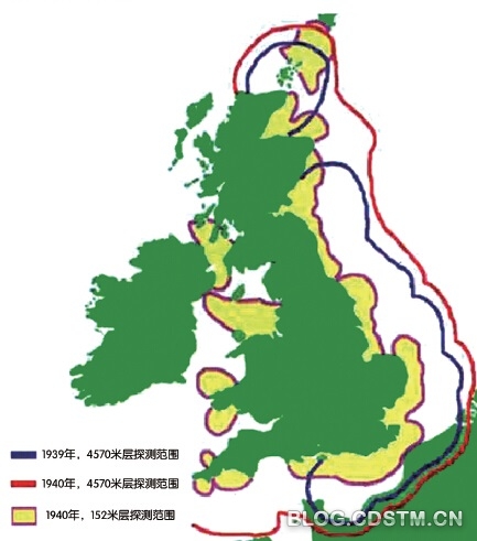 >>“本土链”雷达的探测范围图。由图可见,该雷达网已严密覆盖英吉利海峡和东部海岸的各高度层