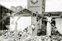 >>1939年8月,重庆市一所学校遭轰炸,部分教室被夷为平地,两位女教师站在瓦砾上,面露忧愤