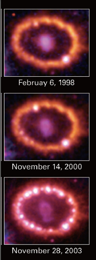 哈勃望远镜于1994年拍摄的照片显示,1987A就像一个圆环,当然这个圆环并不稀奇,它应该早就存在。科学家认为,超新星在爆发以前是一颗蓝色的超巨星,大约在两万年前,蓝超巨星的表面发生了气体膨胀,这些膨胀的气体在它的周围形成了一个气体环,但由于这个气体圆环不够明亮,所以我们看不到它。