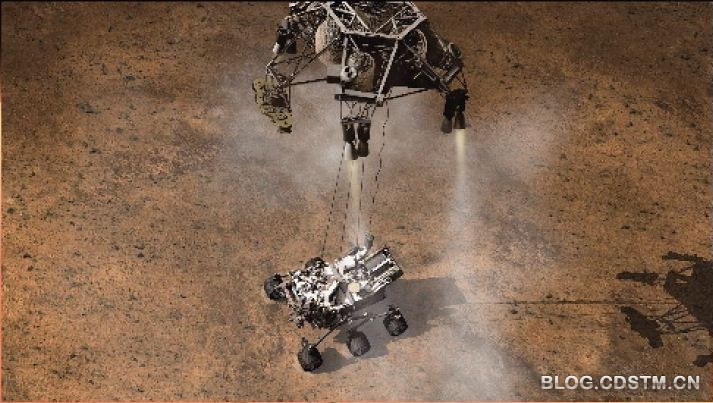 它们俩以组合体的形式一同降落在火星,在经过大气摩擦减速和降落伞减速后,逐渐靠近火星表面。与此同时,“天空起重机”开启反冲推进发动机,进入有动力的缓慢下降阶段。当反冲推进发动机将这对组合体的速度减缓至0.75 米/ 秒之后,一种全新的落地方式出现了。“机遇”号和“勇气”号在着陆火星的时候,都利用反冲推进发动机作为辅助,在距地面一定距离后,关闭动能,自由落地。而“好奇”号的出场则优化了很多———“天空起重机”将它从机内吊出,并悬挂在下方,当距离地面一定高度后,缆绳会被自动切断。“好奇”号成功落地后,“天空起重机”将在距离“好奇”号一定安全距离范围内再行着陆。