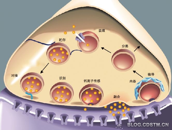 两位美国科学家的研究给囊泡和细胞膜的融合提供了基本的机制,但囊泡融合如何精确被控制,这个问题依然令人困惑不解。共同分享此次诺奖的祖德霍夫则给出了答案,也就是说,祖德霍夫发现了囊泡“投递”物质的秘密。20 世纪90 年代,祖德霍夫开始对大脑内神经细胞是如何在相互之间进行沟通感兴趣。这种传递信息的物质被称为神经递质,这种特殊分子正是由囊泡负责运输至神经细胞的细胞膜上,并能在准确的时机获得释放。科学家们此前便已经知道钙离子参与了这一过程,后来祖德霍夫在神经细胞中找到对钙离子敏感的蛋白质。他还揭示了这种蛋白质的作用原理:它会对注入的钙离子做出反应,并控制邻近的蛋白质迅速让囊泡与神经细胞的外部细胞膜相结合,然后迅速释放信号物质。