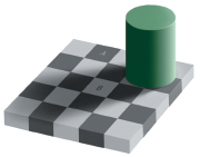 但图中的B方块是不是要浅得多,亮得多?其实是因它们处的区域不同,处在更亮的区域的方块显得暗些,处在更暗的区域的方块显得亮些。