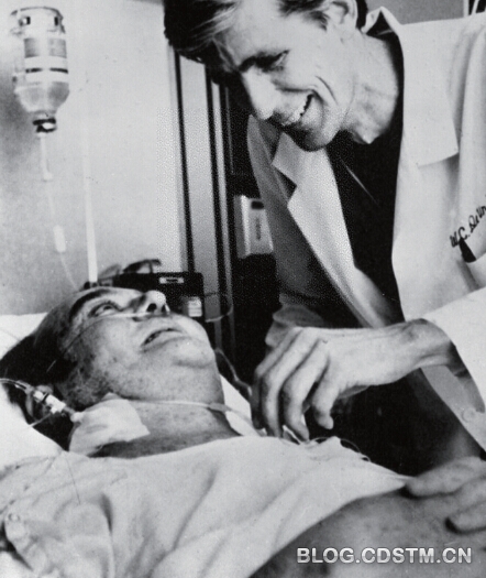 3年过去了。1967 年12 月3 日,历史终于选择了另一位当时还默默无闻的胸外科医生——巴纳德。那一天,在非洲最南端的开普敦,以巴纳德为首,有30 人参与的医疗小组,对时年53 岁的患者华希坎斯基进行了心脏移植手术。10 年来,患者几度因心梗而进行抢救,此时已处于死亡边缘。供体是一位24 岁死于交通事故的女性的健康心脏。患者术前进行了口服多种药物、局部接受放射线等预防“排异”处理。心脏移植手术后患者迅速康复,至第12 天已能起床活动。但令人惋惜的是,到了12 月21 日,一次严重的肺炎却夺去了患者的生命。虽然患者仅仅存活了18 天,但这是世界上首例人类同种异体原位心脏移植成功的手术,具有划时代的历史意义。1968 年1 月2 日,巴纳德本人在深受鼓舞之余,又为一位46 岁的名叫布莱伯格的牙医进行了心脏移植手术。术前,患者心力极度衰竭,只能日夜不眠地坐在床上艰难地喘息。心脏移植手术后3 天,患者的病症就完全消失,74 天后便康复出院。这次手术更创造了患者存活期长达594 天的奇迹!