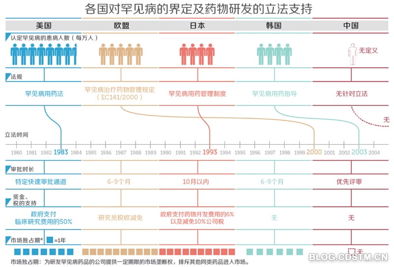 基于孤儿药研发的高风险现状,各个国家纷纷给予了政策支持。美国是世界上第一个对孤儿药实施特别管理制度的国家。美国食品药品监督管理局在1982年就设立了孤儿药产品开发办公室,并于1983年颁布了孤儿药法案,正式实施针对孤儿药的特殊管理。1985年,日本紧跟美国步伐,开始对孤儿药的研发给予支持,并在1993年制定了《罕见病用药管理制度》,增加了针对孤儿药的管理内容,包括研究的全过程可享受基金资助、减税、优先审批、药品再审查时间延长及国家健康保险支付上的优惠等。2000年,欧洲设立了孤儿药委员会,负责评审作为罕见病治疗、预防和诊断的药物。