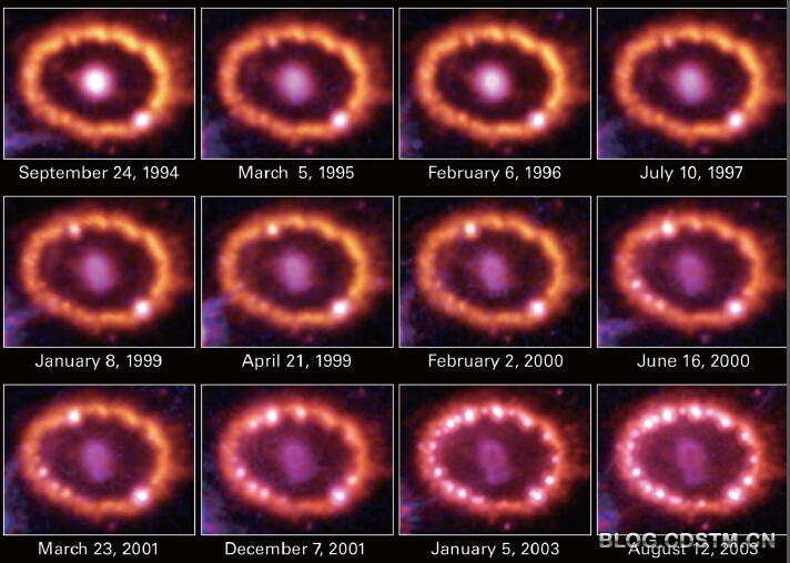 哈勃望远镜于1994年拍摄的照片显示,1987A就像一个圆环,当然这个圆环并不稀奇,它应该早就存在。科学家认为,超新星在爆发以前是一颗蓝色的超巨星,大约在两万年前,蓝超巨星的表面发生了气体膨胀,这些膨胀的气体在它的周围形成了一个气体环,但由于这个气体圆环不够明亮,所以我们看不到它。
