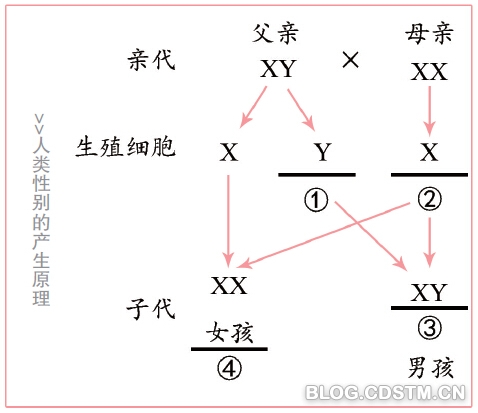 一般而言,通过正常的减数分裂,雌性(XX)只能产生一种含X的卵细胞,而雄性(XY)则能产生含X或Y的两种精子,且比例相等。随后精卵随机结合,而受精卵的性染色体就会有两种可能:XX(雌性)或XY(雄性)。不过总体而言,雌雄比例接近1:1,遵循分离定律。