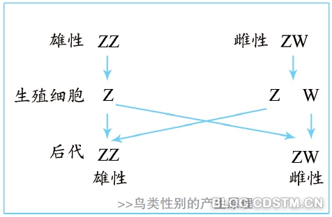 鸟类的性别决定为ZW型,这与XY型正好相反。ZW(异形)为雌性,ZZ(同形)为雄性,其他与XY型无异。而直翅目昆虫的性别决定则为XO型,这取决于性染色体的数目。以蝗虫为例,XX为雌性,有24条染色体,XO(O表示空白,即只有一条X染色体)为雄性,只有23条染色体。