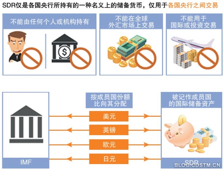 根据国际货币基金组织的解释,SDR 除了作为补充性的国际储备资产外,还是国际货币基金组织及其他一些国际组织的记账单位;特别提款权亦被用于国际货币基金组织与其成员国的融资安排。SDR 并不是一种货币,也不是对国际货币基金组织的债权,而是对国际货币基金组织成员国的(可自由使用货币的)潜在求偿权。